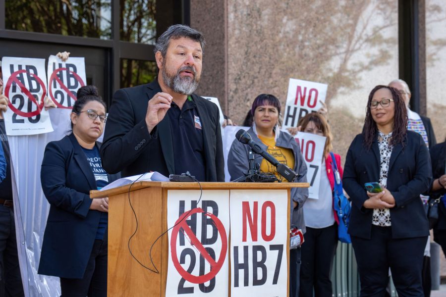 Fernando Garcia, of Border Network for Human Rights, speaks to border and immigrant advocates, community members, and civil rights organizations protesting against immigration bills outside of the John H. Reagan State Office Building in Austin, Texas, on April 12, 2023. – Bills proposed in the Texas legislature are seeking to shift border patrol from federal to state government control. House Bill 20 aims to create “Border Protection Units” comprised of police and “law abiding citizens” who would be granted the ability to use non-lethal force to arrest, detain, and deter individuals crossing the border illegally. (Photo by SUZANNE CORDEIRO / AFP) (Photo by SUZANNE CORDEIRO/AFP via Getty Images)