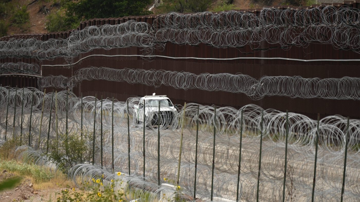 FILE – A vehicle drives along the U.S. side of the US-Mexico border wall in Nogales, Ariz., June 25, 2024.