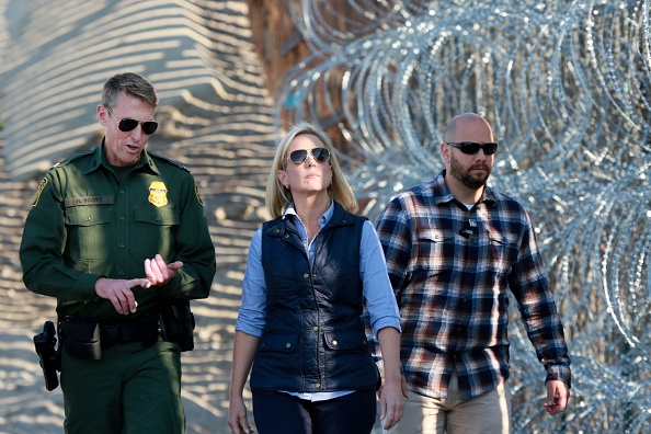 Kirstjen M. Nielsen, Secretary of the Department of Homeland Security, tours the border area with San Diego Section Border Patrol Chief Rodney Scott (L) at Borderfield State Park along the United States-Mexico Border fence in San Ysidro, California on November 20, 2018. – A US federal judge temporarily blocked Donald Trump’s administration from denying asylum to people who enter the country illegally, prompting the president to allege Tuesday that the court was biased against him. (Photo by Sandy Huffaker / AFP) (Photo credit should read SANDY HUFFAKER/AFP via Getty Images)