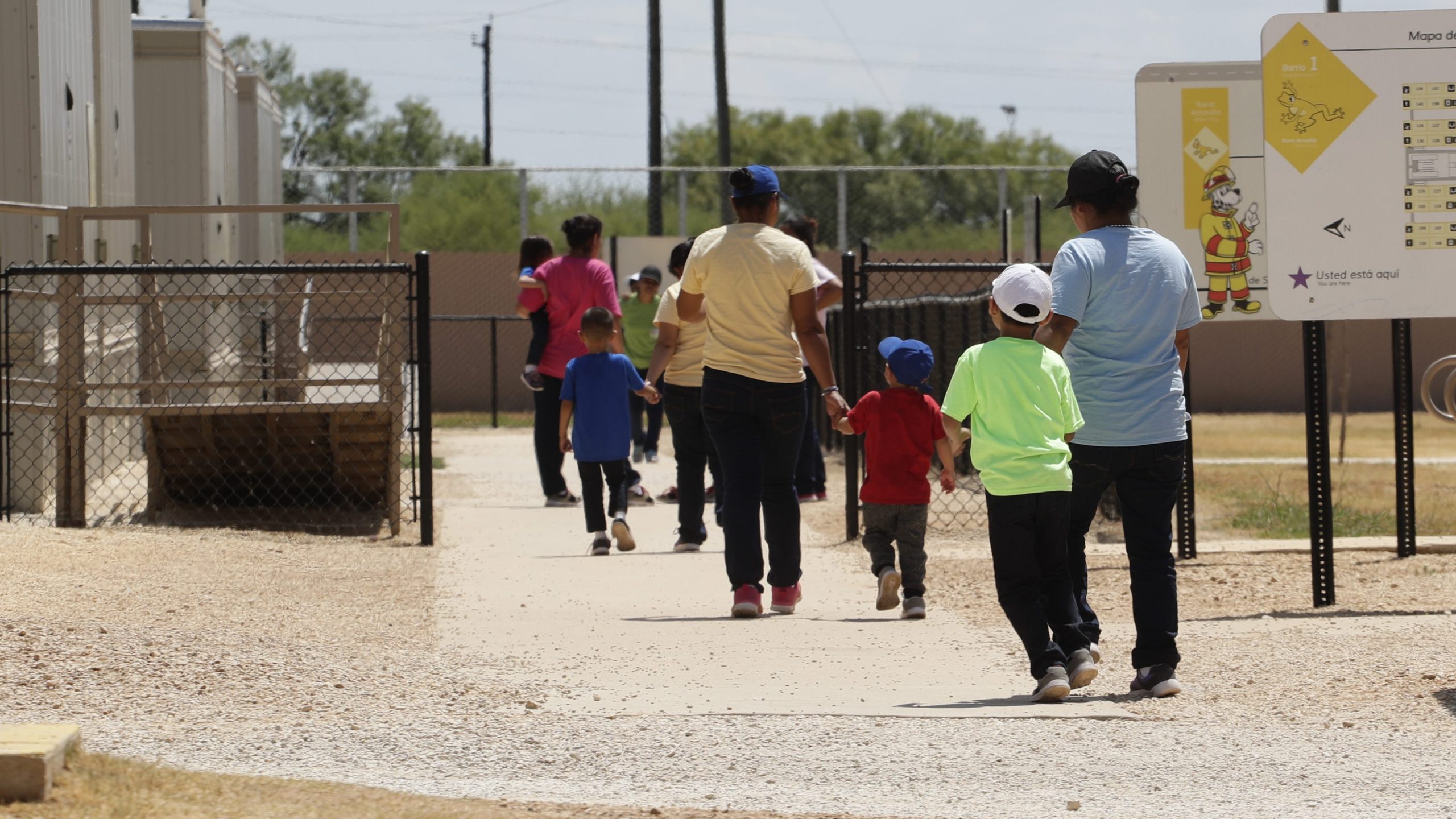 Immigrants seeking asylum hold hands as they leave a cafeteria at the ICE South Texas Family Residential Center in Dilley, Texas. on Aug. 23, 2019. (AP File Photo/Eric Gay)