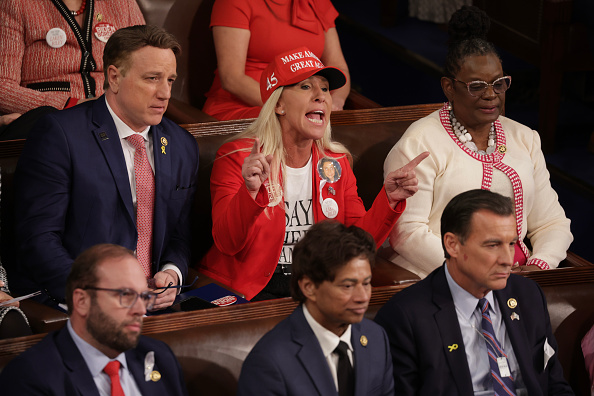WASHINGTON, DC – MARCH 07: U.S. Rep. Marjorie Taylor Greene (R-GA) calls out as U.S. President Joe Biden delivers the State of the Union address during a joint meeting of Congress in the House chamber at the U.S. Capitol on March 07, 2024 in Washington, DC. This is Biden’s last State of the Union address before the general election this coming November. (Photo by Alex Wong/Getty Images)