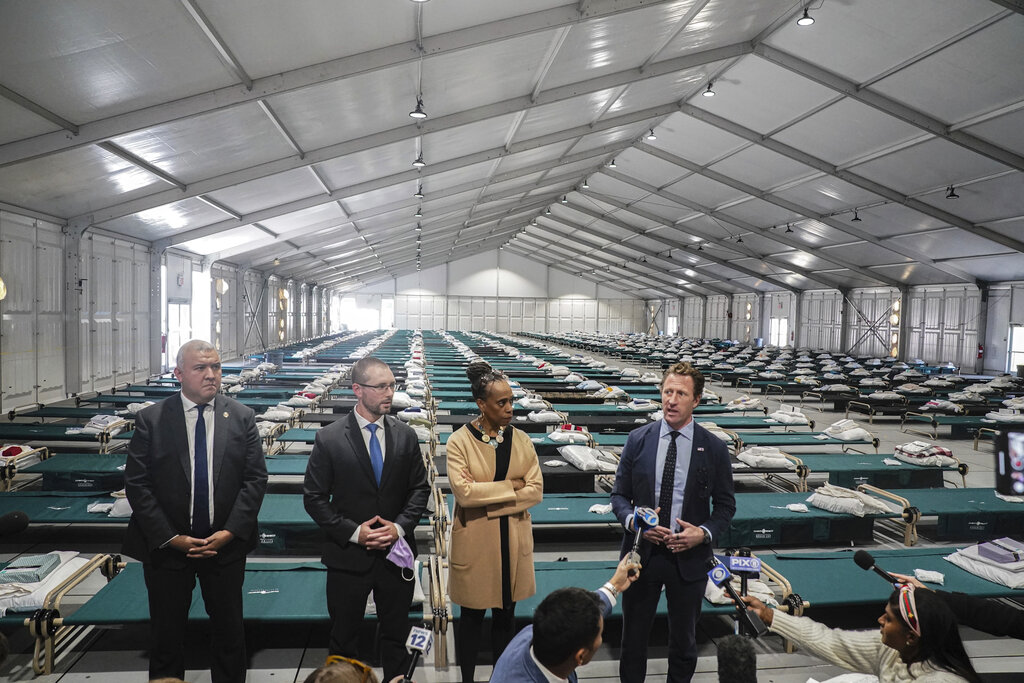 New York’s Office of Immigrant Affairs Commissioner Manuel Castro, far left, Health and Hospital Vice President Dr. Ted Long, second from left, Deputy Mayor for Health and Human Services Anne Williams-Isom, second from right, and Emergency Management Commissioner Zach Iscol, far right, hold a news briefing in the sleeping area of the city’s latest temporary shelter on Randall’s Island, Oct. 18, 2022, in New York. (AP Photo/Bebeto Matthews)