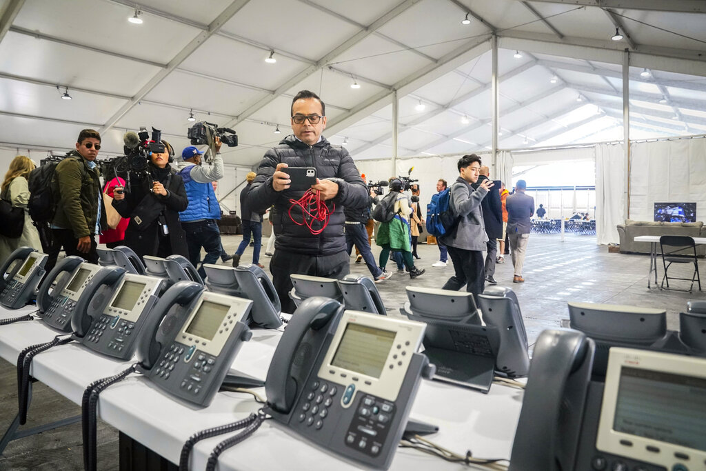 A phone bank center to make international calls, shown during a media tour, is part of New York City’s latest temporary shelter on Randall’s Island for migrants being bused into the city by southern border states, Oct. 18, 2022, in New York. The shelter will start taking in single adult men on Wednesday, Oct. 19, with facilities including laundry, regular meals and a mass sleeping area. (AP Photo/Bebeto Matthews)