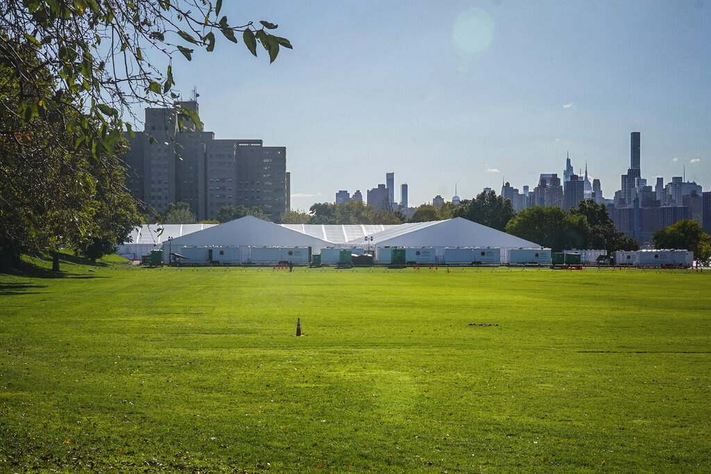 Randall’s Island Humanitarian Emergency Response and Relief Center, center, a complex of giant tents, is New York City’s latest temporary shelter for an influx of international migrants being bused into the city by southern border states, Oct. 18, 2022, in New York. The shelter will start taking in single adult men on Wednesday, Oct. 19, with facilities including laundry, regular meals and access to international calls. (AP Photo/Bebeto Matthews)