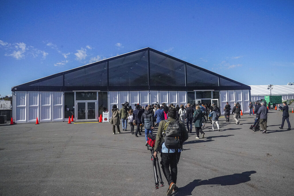 Media arrive for a tour at the Randall’s Island Humanitarian Emergency Response and Relief Center, center, a complex of giant tents to serve as a temporary shelter for migrants being bused into the city by southern border states, Oct. 18, 2022, in New York. The shelter will start taking in single adult men on Wednesday, Oct. 19, with facilities including laundry, regular meals and access to international calls. (AP Photo/Bebeto Matthews)