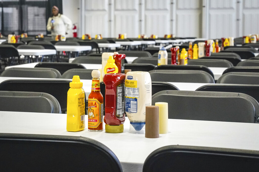 Tables set with condiments for scores of individuals, shown during a media tour, is part of New York City’s latest temporary shelter on Randall’s Island for migrants being bused into the city by southern border states, Oct. 18, 2022, in New York. The shelter will start taking in single adult men on Wednesday, Oct. 19, with facilities including laundry, a mass sleeping area, entertainment and recreation. (AP Photo/Bebeto Matthews)