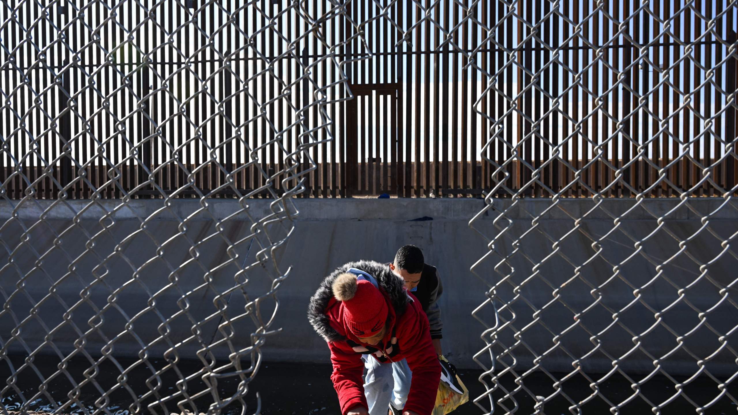 A family of migrants from Columbia climbs up through a canal fence after crossing under a hole in the US-Mexico border wall in El Paso, Texas, on December 19, 2022. – The US Supreme Court halted Monday the imminent removal of a key policy used since the administration of president Donald Trump to block migrants at the southwest border, amid worries over a surge in undocumented immigrants.