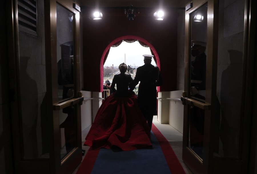 Aides said Harris was dressed in Christopher John Rogers and Sergio Hudson. Both are Black designers, Rogers from Louisiana and Hudson from South Carolina. Harris’ husband, Doug Emhoff, wore a Ralph Lauren suit.