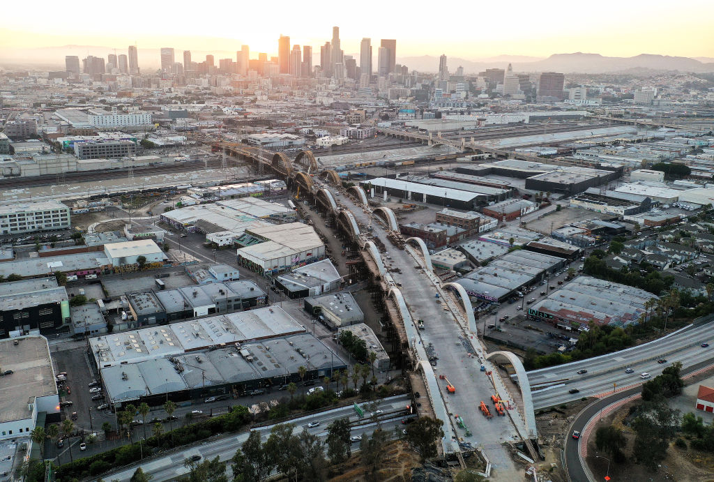 LOS ANGELES, CALIFORNIA – JULY 28: An aerial view as construction continues on the Sixth Street Viaduct replacement project, connecting Boyle Heights with downtown L.A., on July 28, 2021 in Los Angeles, California. The original viaduct was constructed in 1932 and demolished in 2016 after it was determined to be seismically-deficient. The Senate voted today to take up a $1 trillion bipartisan infrastructure plan. (Photo by Mario Tama/Getty Images)