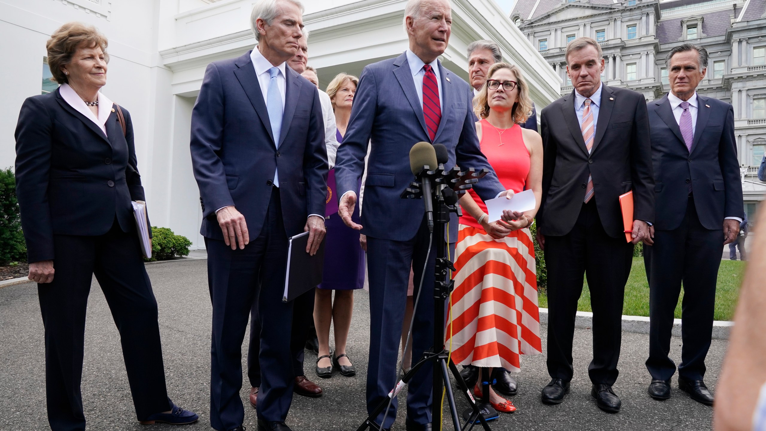 President Joe Biden, with a bipartisan group of senators, speaks Thursday June 24, 2021, outside the White House in Washington. Biden invited members of the group of 21 Republican and Democratic senators to discuss the infrastructure plan. From left are, Sen. Jeanne Shaheen, D-N.H., Sen. Rob Portman, R-Ohio, Sen. Bill Cassidy, R-La., Sen. Lisa Murkowski, R-Alaska, Biden, Sen, Joe Manchin, D-W.Va., Sen. Kyrsten Sinema, D-Ariz, Sen. Mark Warner, D-Va., and Sen. Mitt Romney, R-Utah. (AP Photo/Jacquelyn Martin)