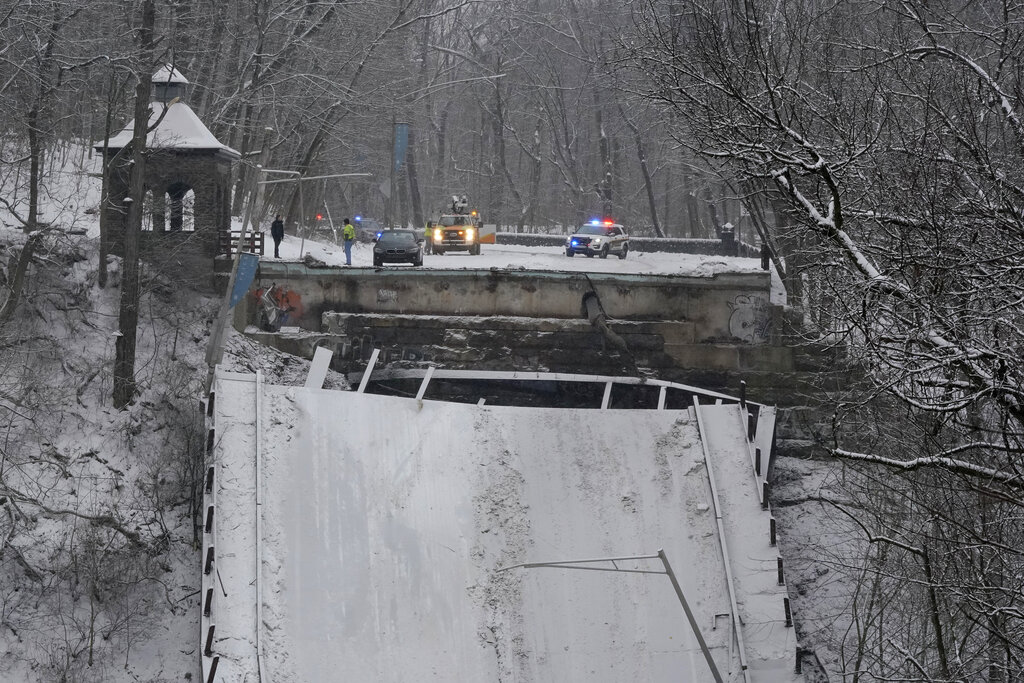 Emergency vehicles are parked at the edge of a bridge that collapsed, Friday Jan. 28, 2022 in Pittsburgh’s East End. A two-lane bridge collapsed in Pittsburgh early Friday, prompting rescuers to rappel nearly 150 feet (46 meters) while others formed a human chain to help rescue multiple people from a dangling bus. (AP Photo/Gene J. Puskar)