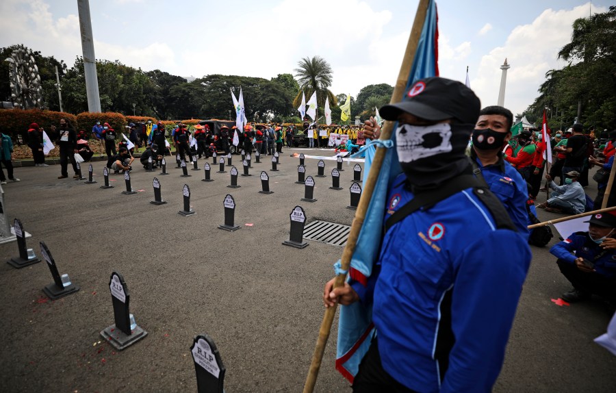 In Indonesia, Southeast Asia’s largest economy, thousands voiced anger at a new jobs law that critics fear will reduce severance pay, lessen restrictions for foreign workers and increase outsourcing as the nation seeks to attract more investment. Protesters in the capital of Jakarta laid mock graves on the street to symbolize hopelessness and marches were being held in some 200 cities.