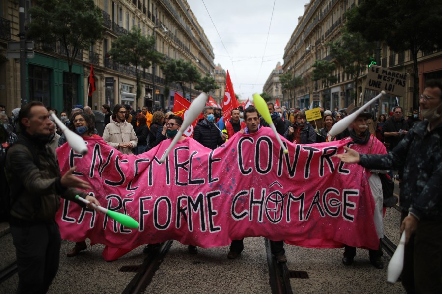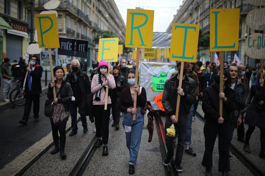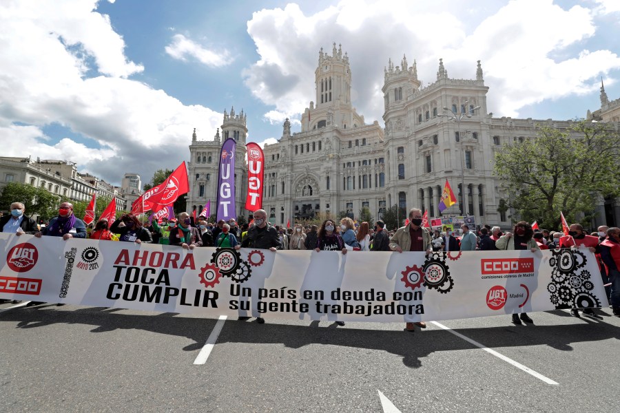 PARIS (AP) — Workers and union leaders dusted off bullhorns and flags that had stayed furled during coronavirus lockdowns for slimmed down but still boisterous, and at times violent, May Day marches on Saturday, demanding more labor protections amid a pandemic that has turned economies and workplaces upside down.