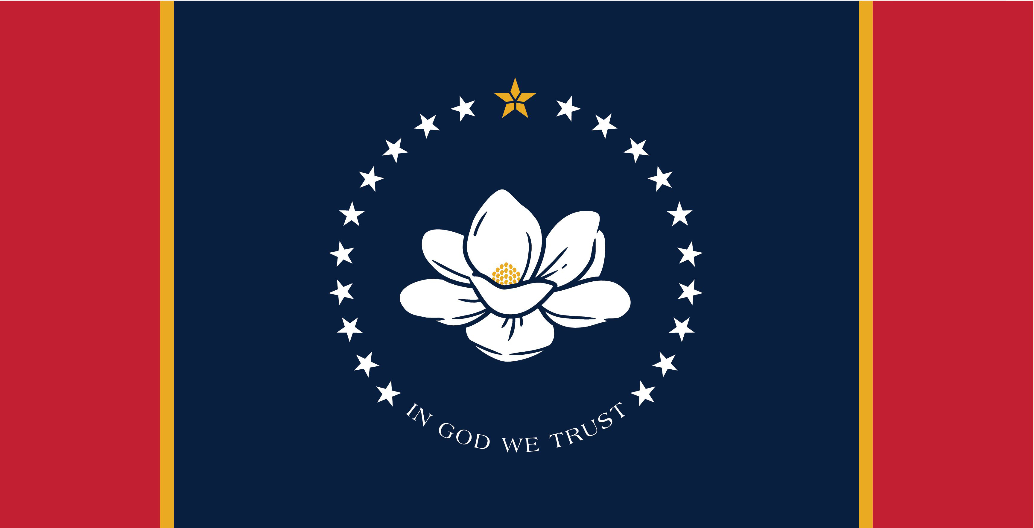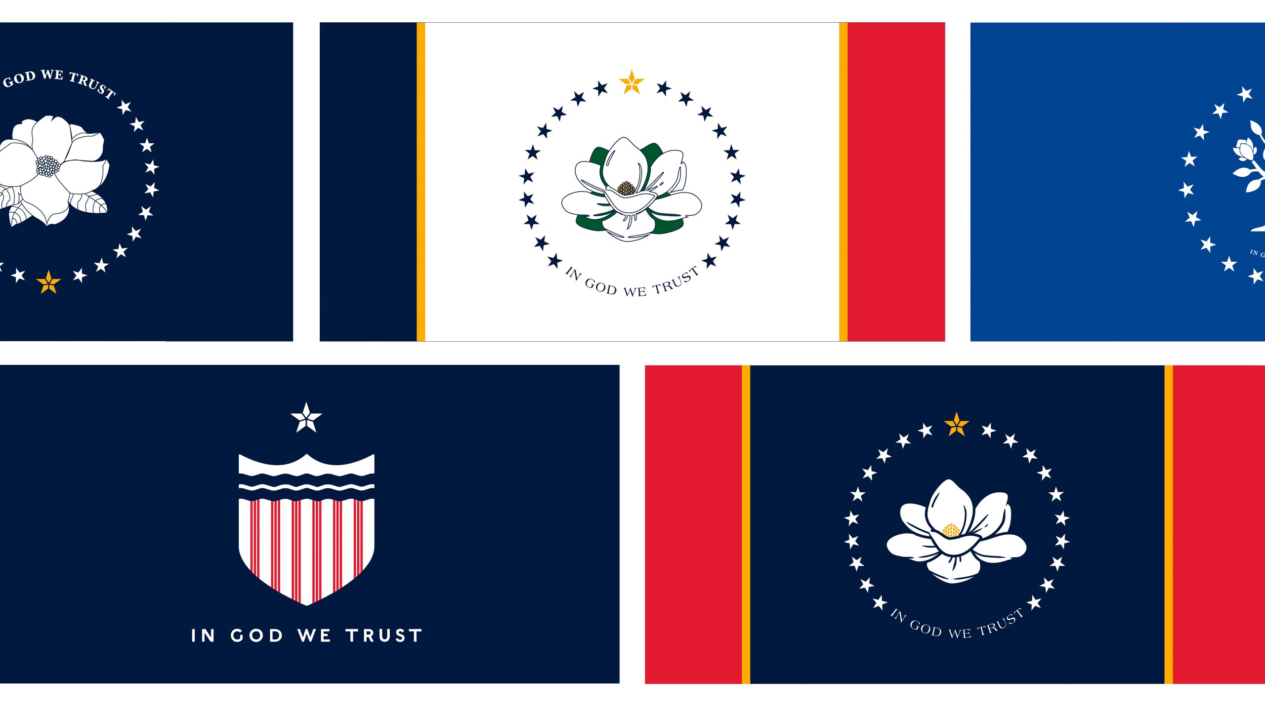 One of the finalists has a magnolia on a dark blue background with red bars on either end. The state flower is encircled by stars representing Mississippi as the 20th state. The other has the red-and-white shield on a dark blue background. The top of the shield has wavy lines representing water.