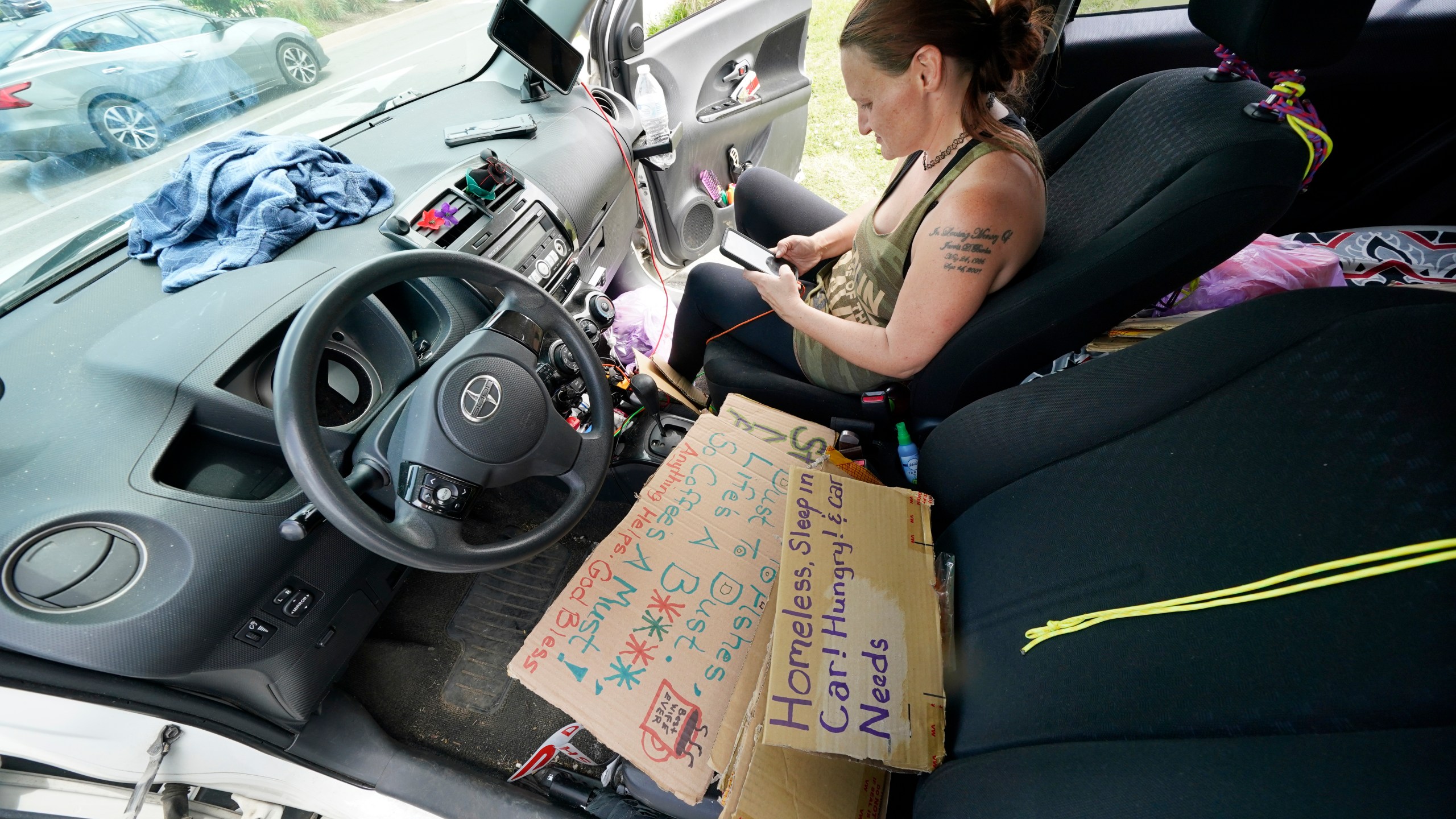 Miranda Atnip sits in her car in a parking lot on May 10, 2022, in Cookeville, Tenn. Atnip lost her home during the coronavirus pandemic and fell behind on bills. She now lives in her car and worries about getting money for food, finding somewhere to shower, and saving up enough money for an apartment where her three children can live with her again. Now she has a new worry: Tennessee is about to become the first U.S. state to make it a felony to camp on local public property such as parks. (AP Photo/Mark Humphrey)