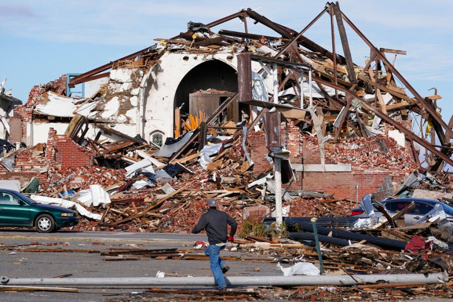 A person walks through debris and damage from a tornado in Mayfield, Ky., on Saturday, Dec. 11, 2021. Tornadoes and severe weather caused catastrophic damage across multiple states Friday, killing multiple people overnight. (AP Photo/Mark Humphrey)