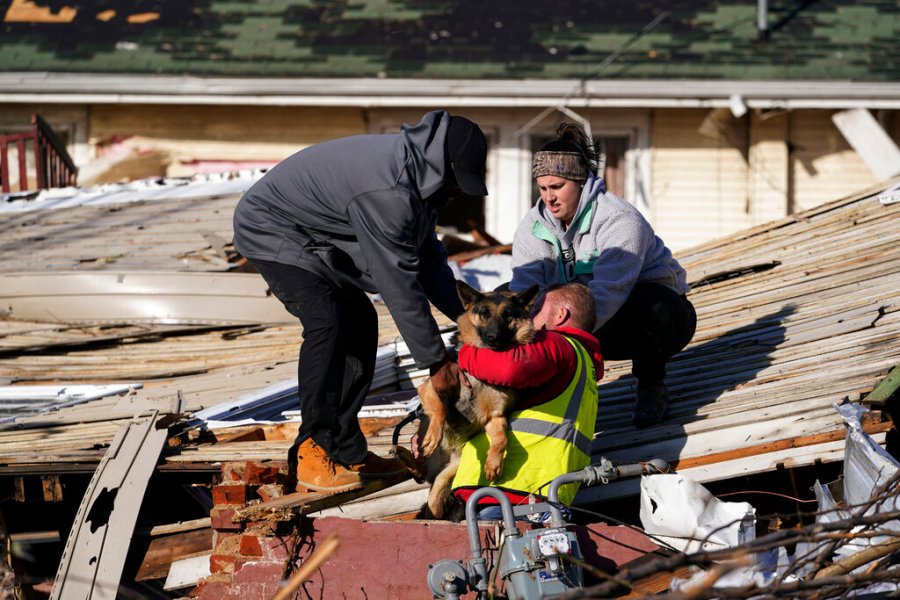 Dog owner Derrick Starks, left, Chris Buchanan, center and Niki Thompson, right, both from neighboring counties, attempt to rescue Cheyenne from a tornado-damaged home in Mayfield, Ky., on Saturday, Dec. 11, 2021. Tornadoes and severe weather caused catastrophic damage across multiple states late Friday, killing dozens of people overnight. (AP Photo/Mark Humphrey)