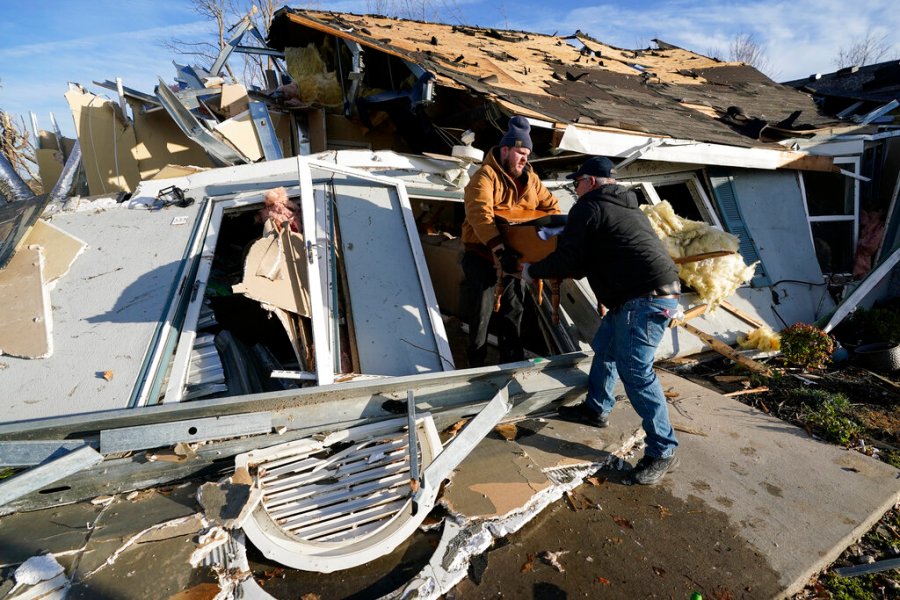 Father and son, Kenny Sanford, right, and Colby Sanford, carry out a dresser from Colby’s grandmother’s tornado-damaged home in Mayfield, Ky., on Saturday, Dec. 11, 2021. Tornadoes and severe weather caused catastrophic damage across several states late Friday, killing multiple people overnight. (AP Photo/Mark Humphrey)