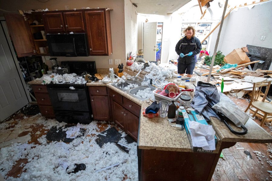 Luke Schockley moves debris from a tornado inside his parent in-law’s house in Bowling Green, Ky., Saturday, Dec. 11, 2021. A monstrous tornado killed dozens of people in Kentucky and the toll was climbing Saturday after severe weather ripped through at least five states, leaving widespread devastation. (AP Photo/Michael Clubb)