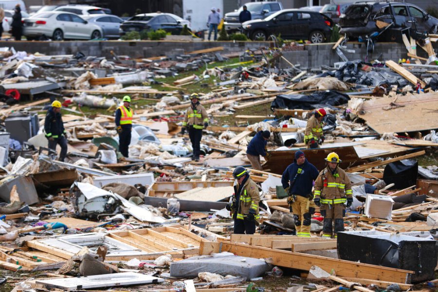 Local firefighters, EMS and first responders check for survivors trapped in homes and vehicles in the neighborhood off Creekwood Avenue in Bowling Green, Ky., early Saturday, Dec. 11, 2021. Tornadoes and severe weather caused catastrophic damage across multiple states late Friday, killing several people overnight. (Grace Ramey/Daily News via AP)