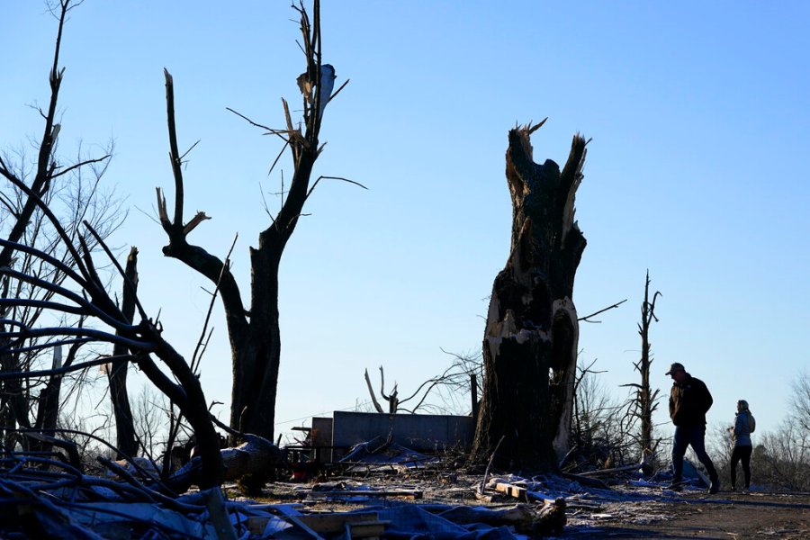 People survey damage from a tornado is seen in Mayfield, Ky., on Saturday, Dec. 11, 2021. Tornadoes and severe weather caused catastrophic damage across multiple states late Friday, killing several people overnight. (AP Photo/Mark Humphrey)