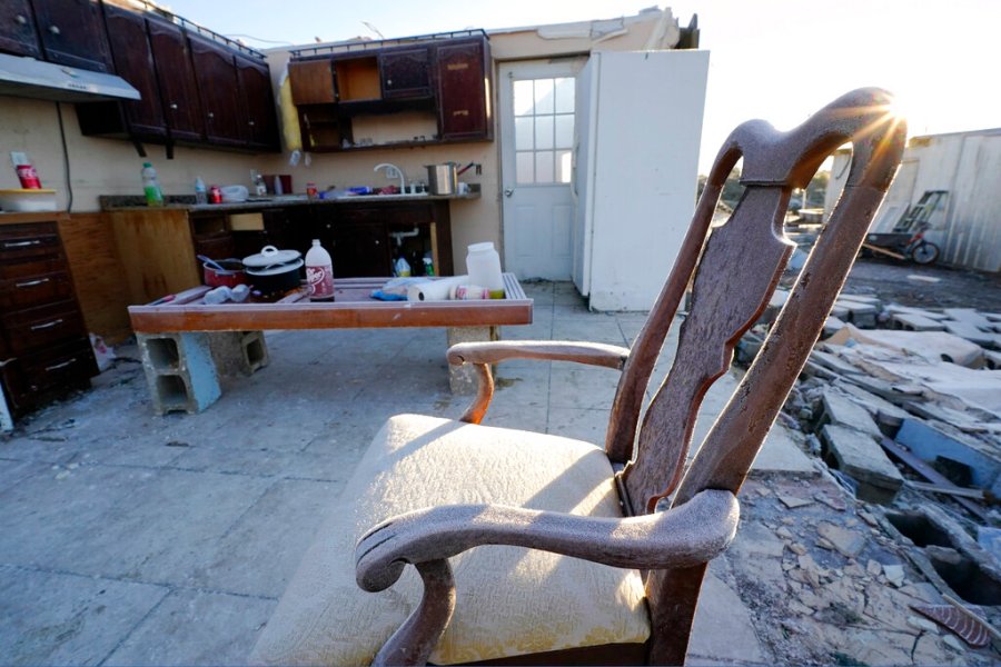 Early morning frost covers a chair sitting in a destroyed home Sunday, Dec. 12, 2021, in Mayfield, Ky. Tornadoes and severe weather caused catastrophic damage across several states Friday, killing multiple people overnight. (AP Photo/Mark Humphrey)
