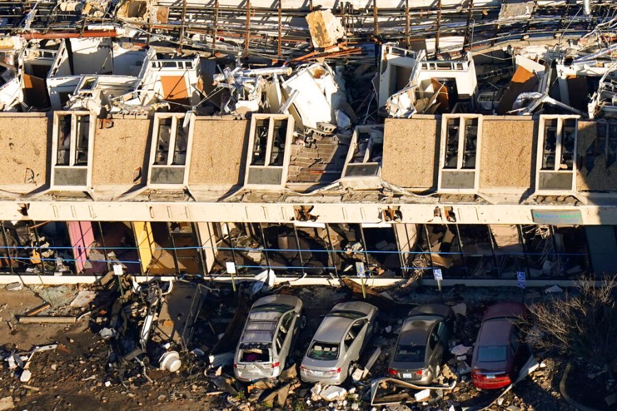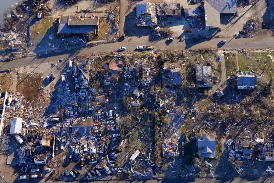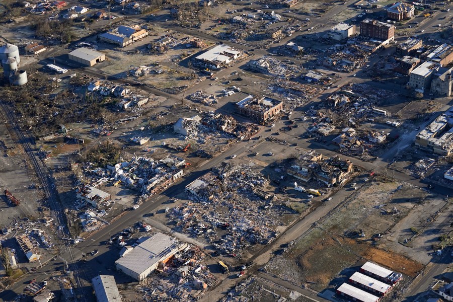 An aerial view is seen of devastating tornado damage in Mayfield, Ky., Sunday, Dec. 12, 2021. Tornadoes and severe weather caused catastrophic damage across multiple states Friday, killing several people overnight. (AP Photo/Gerald Herbert)
