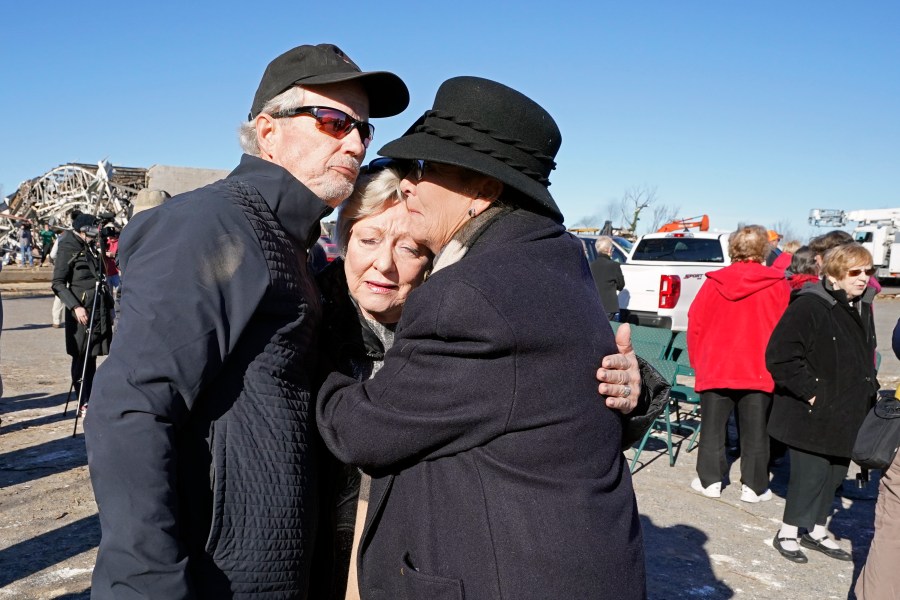 Arthur Byrn, left; Carole Dowdy, center; and Carla McDonald console each other after an outdoor service was held at First Christian Church Sunday, Dec. 12, 2021, in Mayfield, Ky. The church building was heavily damaged when tornadoes and severe weather caused catastrophic damage across several states Friday, killing multiple people. (AP Photo/Mark Humphrey)