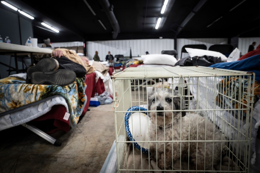 A dog sits in a cage next to a sleeping man inside a shelter in Wingo, Ky., on Sunday, Dec. 12, 2021, after residents were displaced by a tornado that caused severe damage in the area. (AP Photo/Robert Bumsted)