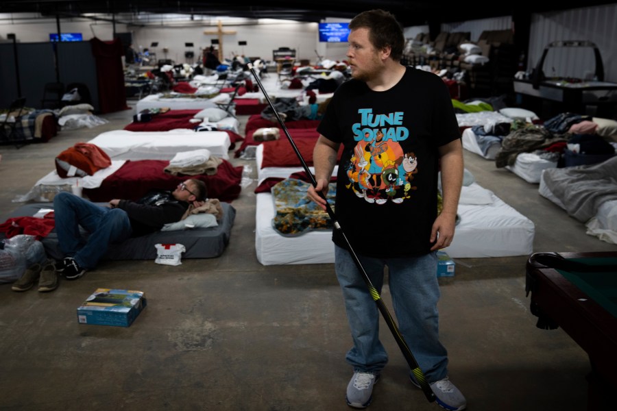 A man plays pool inside a shelter in Wingo, Ky., on Sunday, Dec. 12, 2021, after his home was damaged by a tornado that ripped through the area. (AP Photo/Robert Bumsted)