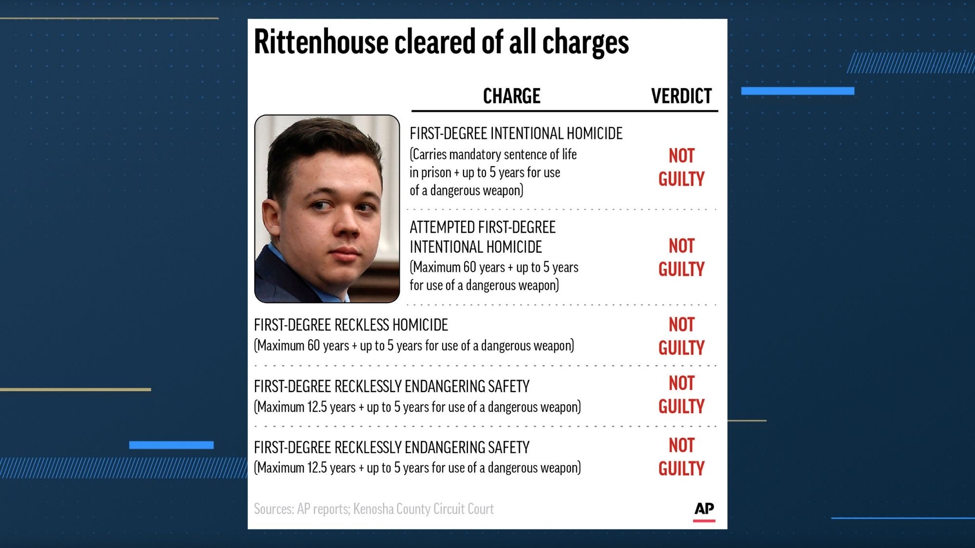 MADISON, Wis. (AP) — Kyle Rittenhouse shot three men, killing two of them and wounding the third, during a protest against police brutality in Kenosha, Wisconsin, last year. Rittenhouse argued that he fired in self-defense after the men attacked him. Here’s a look at the charges that prosecutors carried into court, as well as lesser charges that the judge put before the jury in his final instructions.