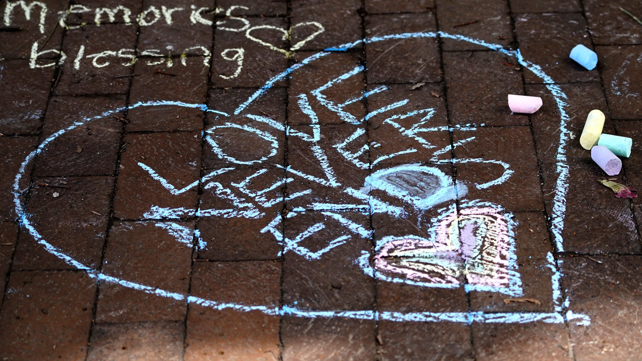 Chalk written signs dedicated to the seven people killed in Monday’s Fourth of July mass shooting are pictured on a sidewalk at a memorial site, Thursday, July 7, 2022, in Highland Park, Ill. (AP Photo/Nam Y. Huh)