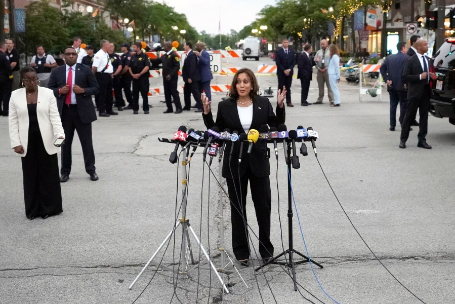 “The whole nation should understand and have a level of empathy, to understand that this can happen anywhere, in any peace-loving community,” Harris said in brief comments to reporters in Highland Park.