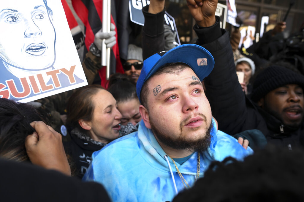 They chanted “Say his name! Daunte Wright.” Some held yellow signs that said “guilty” in large block letters.