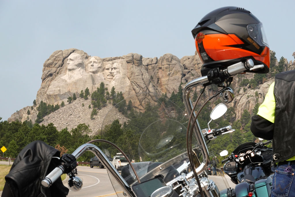 KEYSTONE, SOUTH DAKOTA – AUGUST 09: Bikers stop to take in Mt. Rushmore on August 09, 2021 near Keystone, South Dakota. Every August hundreds of thousands of motorcycling enthusiasts are attracted to the southwest corner of South Dakota for the annual Sturgis Motorcycle Rally. This year the rally is expect to draw more than 500,000 people during its 10-day run. (Photo by Scott Olson/Getty Images)