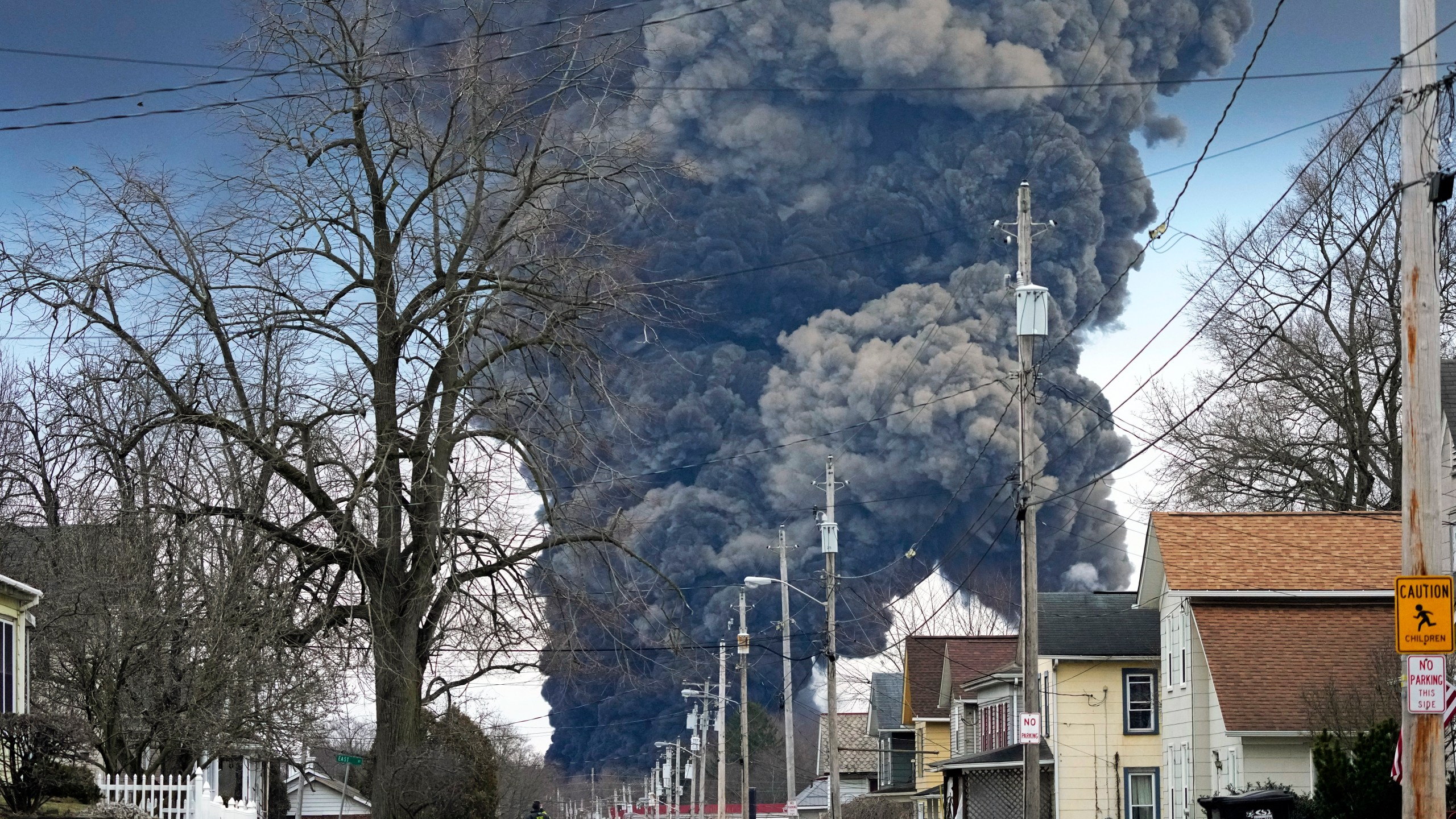 FILE – A plume rises over East Palestine, Ohio, as a result of the controlled detonation of a portion of the derailed Norfolk Southern trains, Feb. 6, 2023. After the catastrophic train car derailment in East Palestine, Ohio, some officials are raising concerns about a type of toxic substance that tends to stay in the environment. (AP Photo/Gene J. Puskar, File)