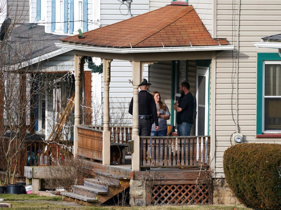 An Ohio state trooper goes door to door telling residents to leave downtown East Palestine, Ohio, on Sunday, Feb. 5, 2023. A smoldering tangle of dozens of derailed freight cars, some carrying hazardous materials, has kept an evacuation order in effect in Ohio near the Pennsylvania state line as environmental authorities warily watch air quality monitors. (Lucy Schaly/Pittsburgh Post-Gazette via AP)