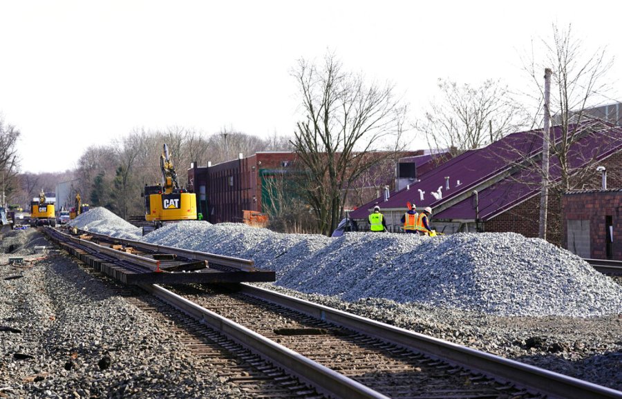 Equipment and gravel pile up along the railroad tracks in downtown East Palestine, Ohio, on Sunday, Feb. 5, 2023. A smoldering tangle of dozens of derailed freight cars, some carrying hazardous materials, has kept an evacuation order in effect in Ohio near the Pennsylvania state line as environmental authorities warily watch air quality monitors. (Lucy Schaly/Pittsburgh Post-Gazette via AP)