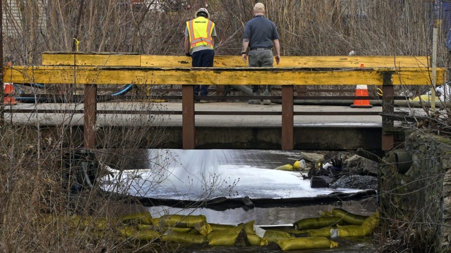 Workers observe a stream in East Palestine, Ohio, Thursday, Feb. 9, 2023 as the cleanup continues after the derailment of a Norfolk Southern freight train Friday. Officials are estimating that thousands of fish and other species are dead as a result of the incident. (AP Photo/Gene J. Puskar)