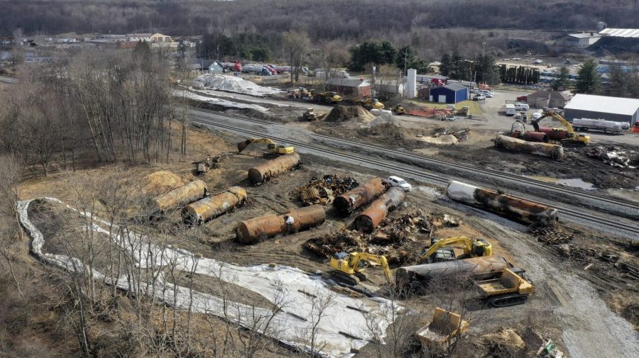 File – A view of the scene Friday, Feb. 24, 2023, as the cleanup continues at the site of of a Norfolk Southern freight train derailment that happened on Feb. 3 in East Palestine, Ohio.