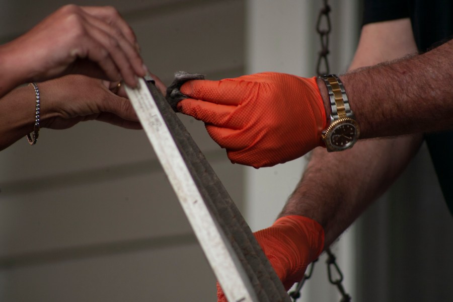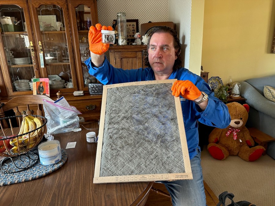 Scott Smith, chief sustainability officer at ECO Integrated Technologies, Inc., tests a furnace filter outside an East Palestine, Ohio home Tuesday, May 16, 2023.