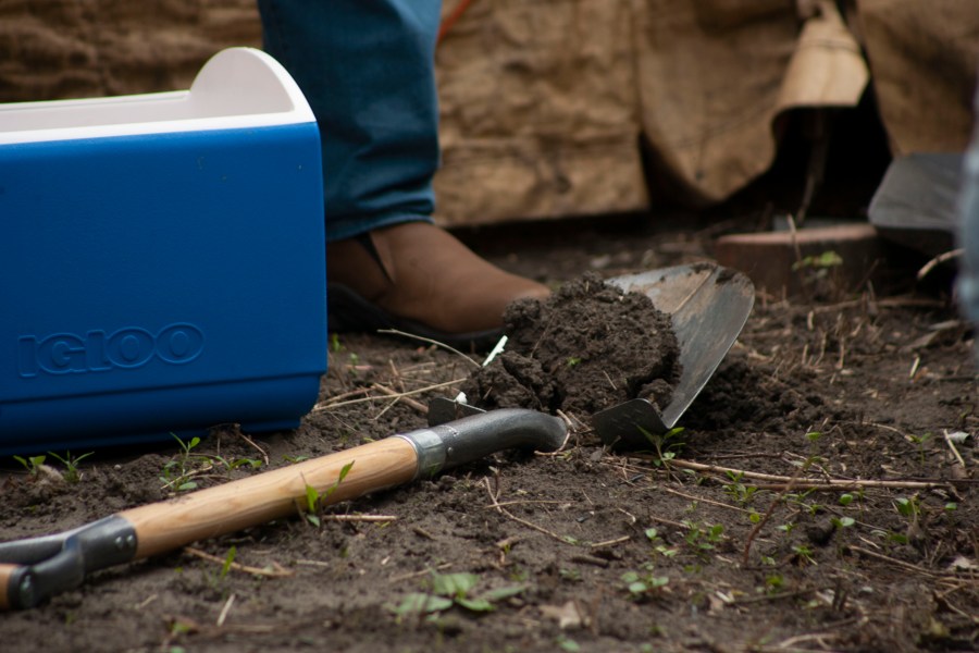 A shovel lays on the ground after being used to collect a soil sample from an East Palestine home on May 16, 2023.