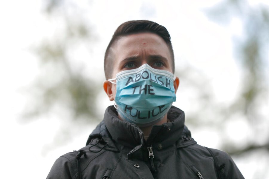 A person wearing a face mask reading “Abolish the Police” attends a vigil honoring the life of police shooting victim 13-year-old Adam Toledo, Sunday, April 18, 2021, in Chicago’s Douglass Park. (AP Photo/Shafkat Anowar)