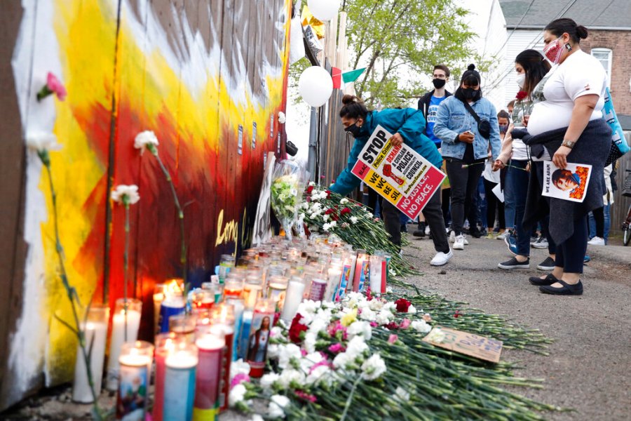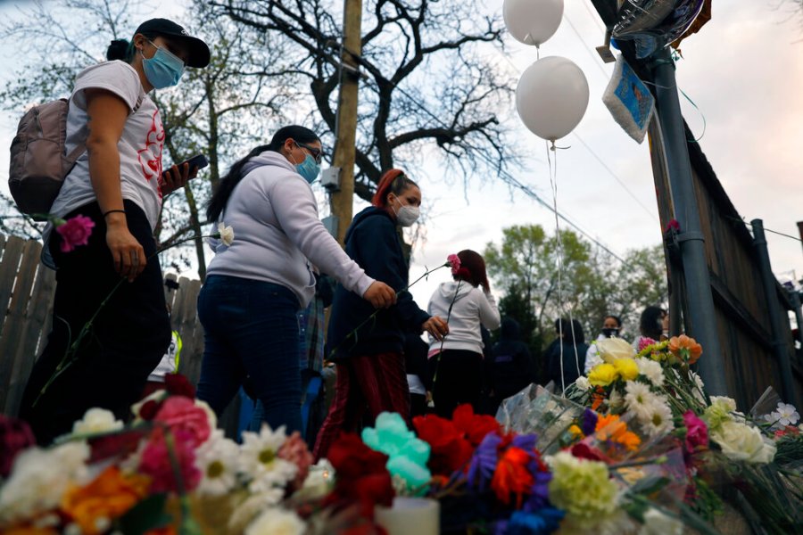 People pay tribute as they attend a peace walk honoring the life of police shooting victim 13-year-old Adam Toledo, Sunday, April 18, 2021, in Chicago’s Little Village neighborhood. (AP Photo/Shafkat Anowar)