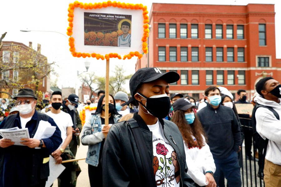 Demonstrators attend a peace walk honoring the life of police shooting victim 13-year-old Adam Toledo, Sunday, April 18, 2021, in Chicago’s Little Village neighborhood. (AP Photo/Shafkat Anowar)
