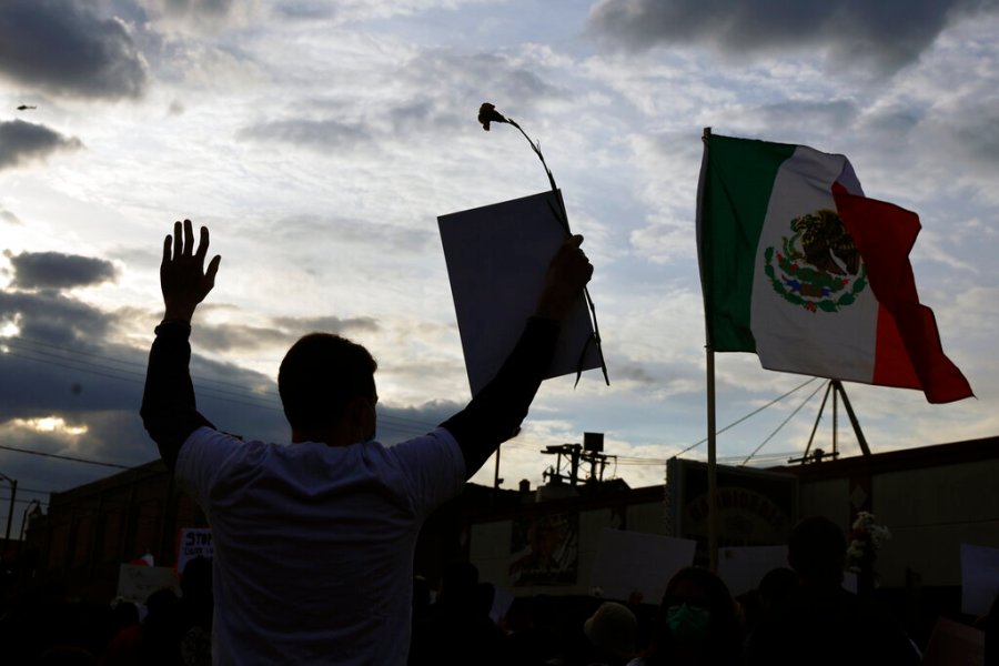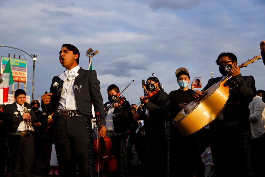 A mariachi band sings in front of the demonstrators as they take part in a peace walk honoring the life of police shooting victim 13-year-old Adam Toledo, Sunday, April 18, 2021, in Chicago’s Little Village neighborhood. (AP Photo/Shafkat Anowar)