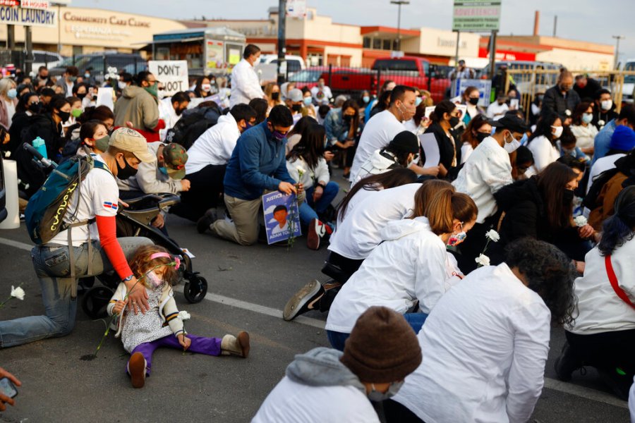 A kid sits on the road as other demonstrators take a knee during a peace walk honoring the life of police shooting victim 13-year-old Adam Toledo, Sunday, April 18, 2021, in Chicago’s Little Village neighborhood. (AP Photo/Shafkat Anowar)