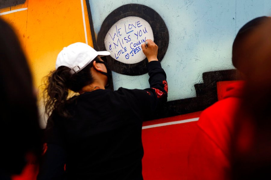 People write on a mural as they attend a peace walk honoring the life of police shooting victim 13-year-old Adam Toledo, Sunday, April 18, 2021, in Chicago’s Little Village neighborhood. (AP Photo/Shafkat Anowar)