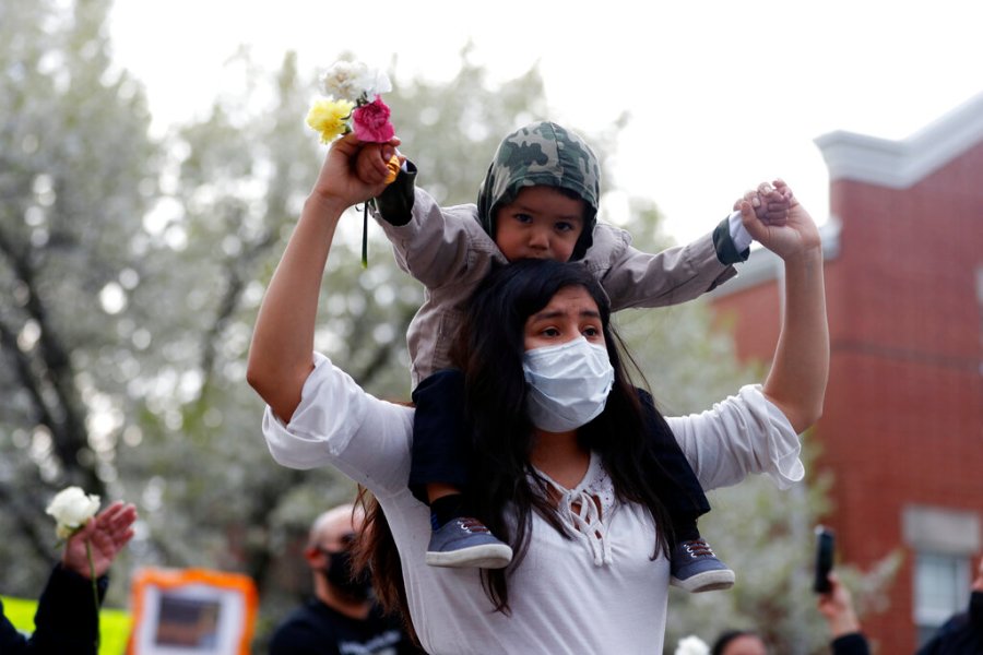 A woman carrying a kid raises her hand as they attend a peace walk honoring the life of police shooting victim 13-year-old Adam Toledo, Sunday, April 18, 2021, in Chicago’s Little Village neighborhood. (AP Photo/Shafkat Anowar)