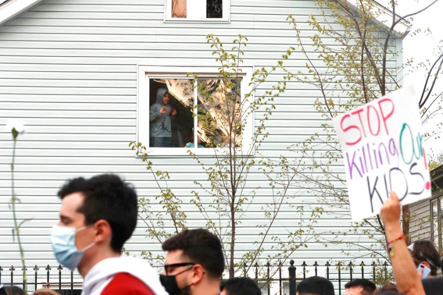 A kid looks out of a window as demonstrators attend a peace walk honoring the life of police shooting victim 13-year-old Adam Toledo, Sunday, April 18, 2021, in Chicago’s Little Village neighborhood. (AP Photo/Shafkat Anowar)